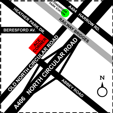 Ace Corner is the junction of Beresford Avenue and the old North Circular Road, this runs parallel with the New Circular Road, between the A40 and the A404 (Harrow Road).