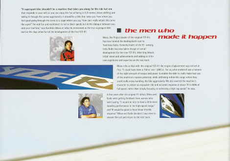 THE MEN WHO MADE IT HAPPEN “A super sport bike shouldn’t be a machine that takes you along for the ride but one that responds to your will, so you can enjoy the fun of being in full control, down shifting and taking it through the curves aggressively. It should be a bike that takes you from where you feel good going through the turns to a stage where you say, ‘How can I really attack this curve like a pro?’ The real fun and excitement is not in the sheer speed, but in the dialogue between you and your machine,” says Kunihiko Miwa on what he envisioned as the true super sport bike back in the days when he led the development of the first YZF-R1. Miwa, the Project Leader of the original YZF-R1, has now handed the leading torch over to Yoshikazu Koike. Formally leader of the R1 running tests, Koike has now taken charge of overall development for the new YZF-R1, inheriting Miwa’s initial vision and achievements and adding it to his own experience and expertise on the test track.